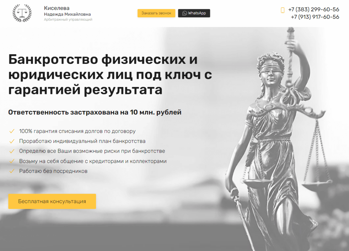 Небольшой лендинг для арбитражного управляющего по банкротству физических лиц Киселёвой Надежды, г. Новосибирск.