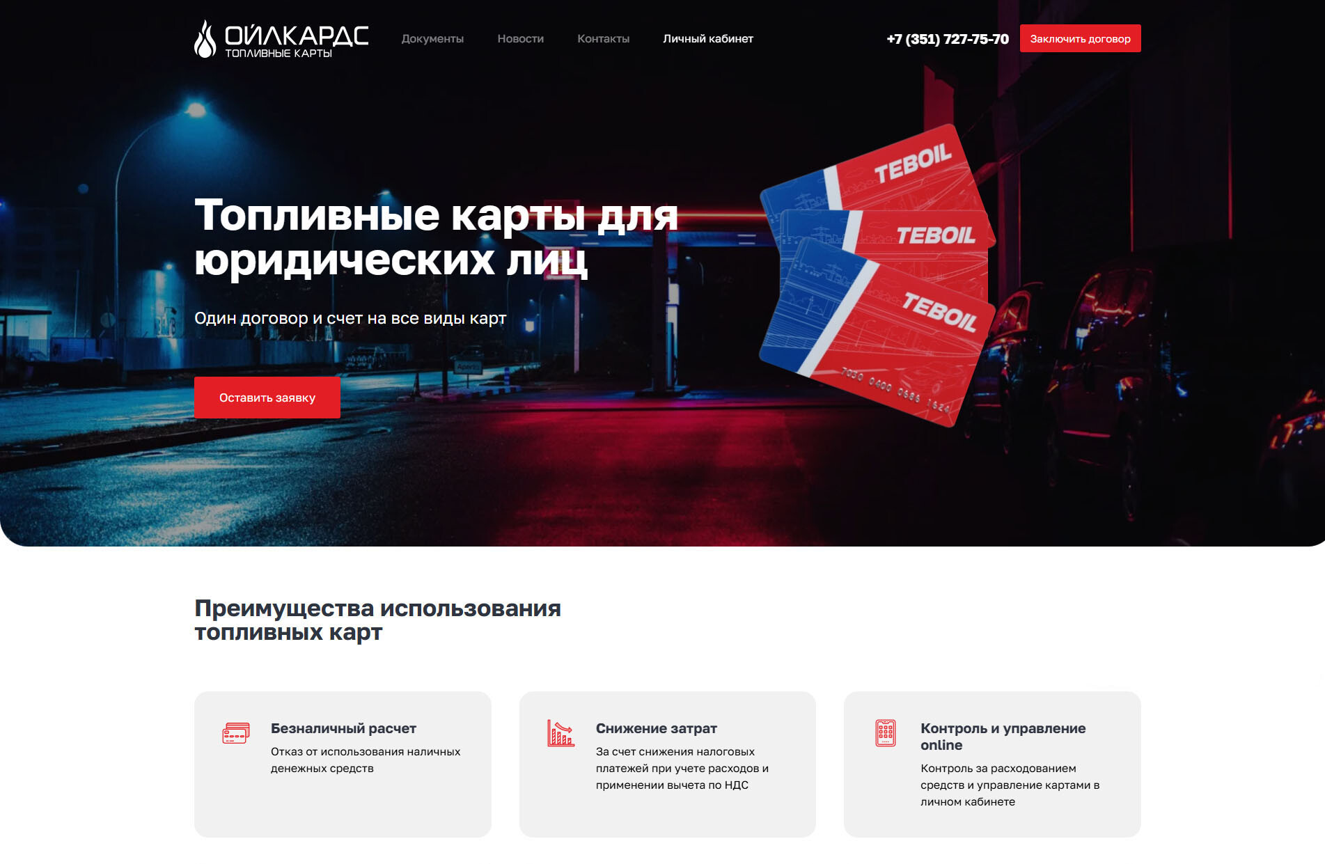 Сайт оператора топливных карт для юридических лиц ОйлКардс. Сайт разработан под конеткстную рекламу с целью заполнения анкеты для заключения договора.