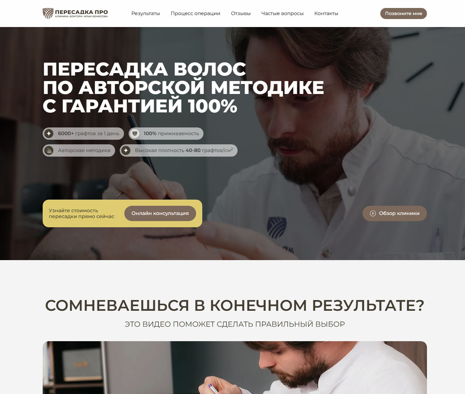Разработка лендинга для клиники по пересадке волос «Пересадка ПРО». Сайт содержит УТП, ключевые преимущества, примеры и порядок работ, отзывы клиентов. Структура лендинга оптимизирована под контекстную рекламу в Яндекс Директ.