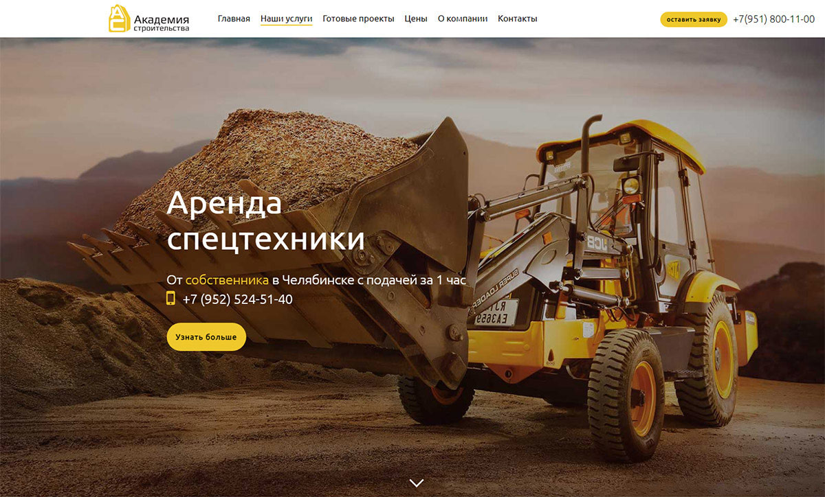 Создание посадочной страницы (Landing Page) по аренде спецтехники (автокраны, манипуляторы, экскаваторы, погрузчики, самосвалы) для строительной компании в Челябинске.