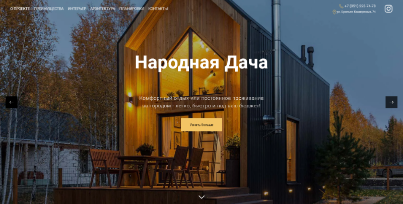Разработка одностраничного сайта лендинга для компании по проектированию, производству и продаже домокомплектов в стиле барнхаус "Народная Дача". Промо-сайт с описанием преимуществ проекта, решений дизайна интерьера и планировками.