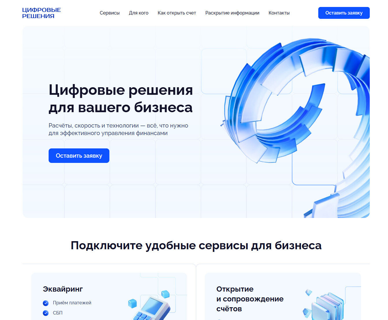 Разработка сайта-визитки для расчётной небанковской кредитной организации. Открытие и сопровождение счетов: расчётное обслуживание, составление ежедневных выписок, исполнение платёжных поручений, формирование финансовых документов.