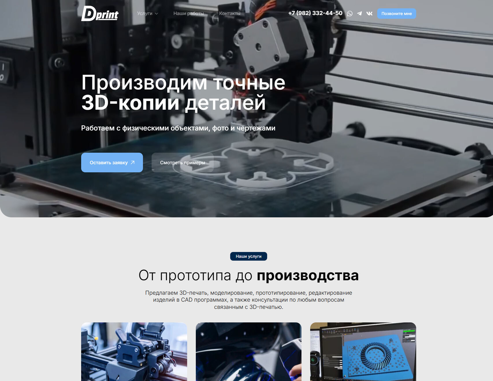 Разработка сайта компании по предоставлению услуг 3D-печати, моделирования, прототипирования, редактирования изделий в CAD программах, а также консультации по любым вопросам связанным с 3D-печатью.