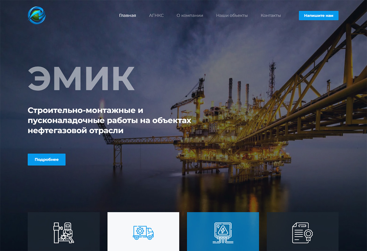 Корпоративный сайт для компании ООО "ЭМИК", занимающейся строительно-монтажными и пусконаладочными работами на объектах нефтегазовой отрасли и комплексным строительством автомобильных газонаполнительных компрессорных станций (АГНКС).