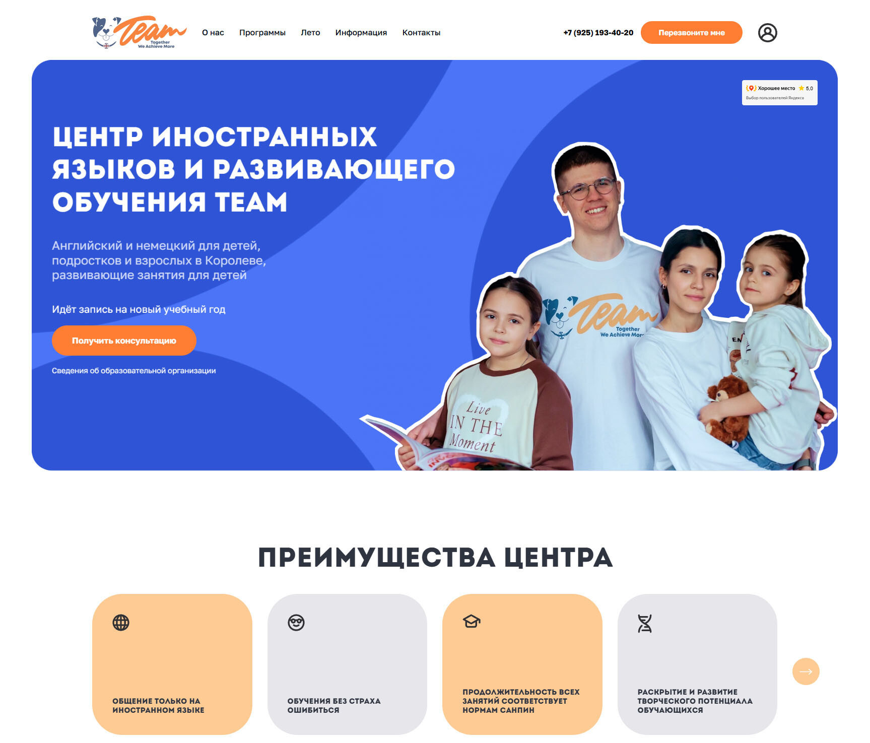 Корпоративный сайт для образовательного учреждения - центра изучения иностранных языков и развивающего обучения Team. Помимо основных информационных разделов, сайт имеет личный кабинет, разделенный по ролям: для преподавателей и учеников, для размещения домашних заданий. Сайт имеет панель настройки доступности для слабовидящих.