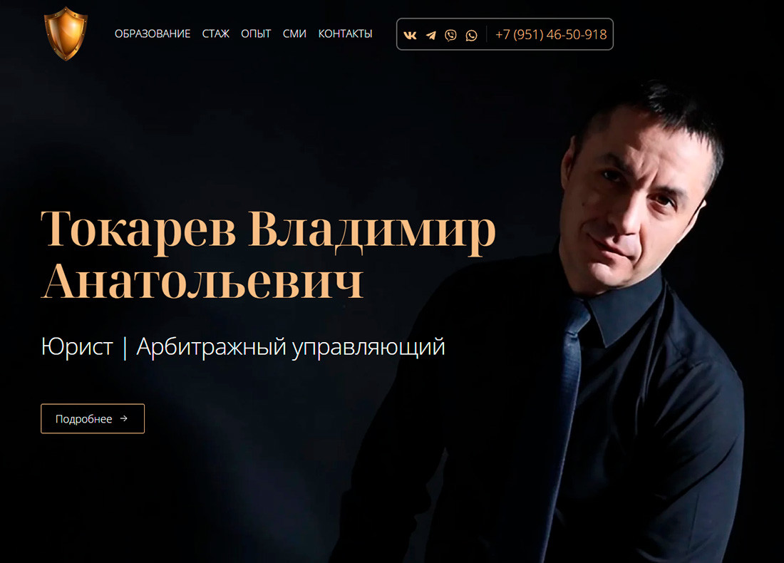 Создание небольшого одностраничного сайта-визитки для юриста и арбитражного управляющего Токарева Владимира Анатольевича.
