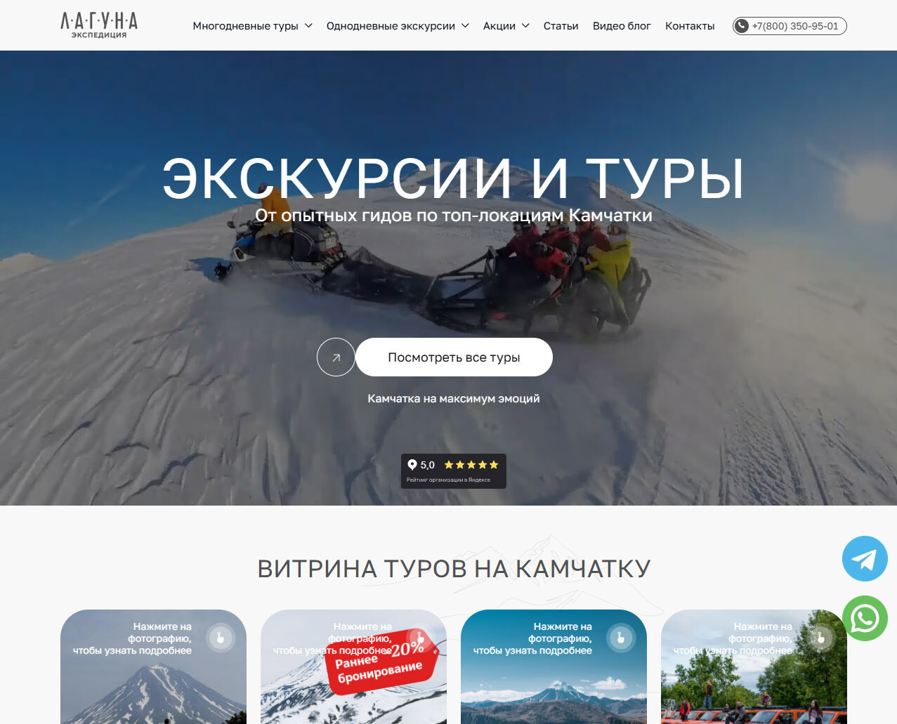 Корпоративный сайт туроператора на Камчатке «Лагуна Экспедиция». Сайт работает в системе по онлайн-продаже туров и экскурсий АтомсТревел Коннект.